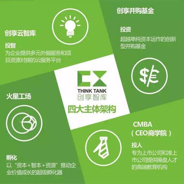 創(chuàng)享智庫主體架構(gòu)包括一個云智庫中國民營企業(yè)外腦服務平臺,一支并購基金、一家創(chuàng)新型孵化器、一所全球CMBA(企業(yè)CEO商學院),為企業(yè)提供從戰(zhàn)略定位、商業(yè)模式優(yōu)化到股權(quán)改造、資本運營的系統(tǒng)解決方案。