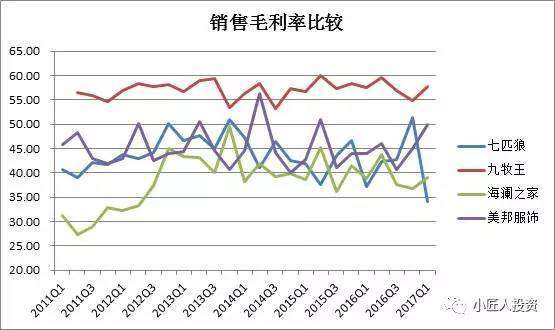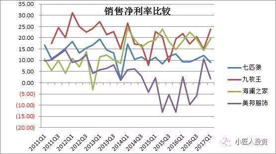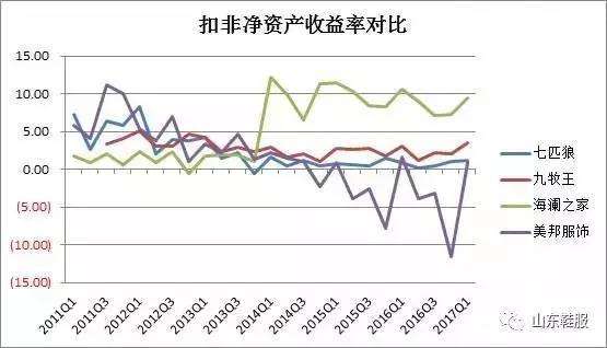 從營(yíng)業(yè)收入增速來(lái)看,自2011年以來(lái)行業(yè)增速持續(xù)下降,直到2013年底,四家公司開始呈現(xiàn)差異,海瀾之家異軍突起,快速發(fā)展,但只維持了一年左右隨即掉頭向下。從2017年一季度情況來(lái)看,美邦的營(yíng)收還在下滑,海瀾之家保持持平,只有七匹狼和九牧王出現(xiàn)轉(zhuǎn)好跡象,營(yíng)收開始恢復(fù)正增長(zhǎng),但是增長(zhǎng)幅度也僅是個(gè)位數(shù)。