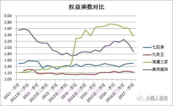 從權(quán)益乘數(shù),也就是財(cái)務(wù)杠桿來(lái)看,海瀾之家最高,美邦服飾其次,九牧王和七匹狼較低。這也一定程度上解釋了海瀾之家較高的凈資產(chǎn)收益率。