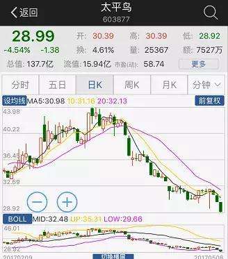 利潤不及預期,本就讓太平鳥心里不順暢,連跌數日的股價,更一度將這只“金鳳凰”打回原形。從3月28日開始,太平鳥股價從開盤的41.8元傾瀉而下一直跌到了5月8日收盤的28.99元,跌幅達到30.6%。已經回到了發(fā)行價21.3元的20元股行列。好像這只被寄予厚望的逆勢快消股,也免不了落入了次新股下跌的俗套。太平鳥的市值已經從3月16日的巔峰246億元跌到今日收盤的159億元,幾近減少了靠100億元。