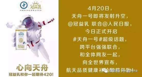 作為中國(guó)航天事業(yè)的戰(zhàn)略合作伙伴,蒙牛冠益乳聯(lián)合《人民日?qǐng)?bào)》在4月19日即天舟一號(hào)發(fā)射前一天,發(fā)起#天舟一號(hào)#預(yù)熱話(huà)題,上線(xiàn)10小時(shí),閱讀量即突破380萬(wàn)。冠益乳提前搶占熱點(diǎn),并借助擁有5000W+的媒體大V@人民日?qǐng)?bào),成功進(jìn)行了借勢(shì)營(yíng)銷(xiāo)。