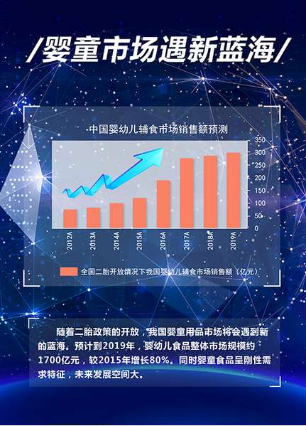 隨著二胎政策的開(kāi)放,我國(guó)嬰童用品市場(chǎng)將會(huì)遇到新的藍(lán)海,預(yù)計(jì)到2019年,嬰幼兒食品整體市場(chǎng)規(guī)模約1700億元,較2015年增長(zhǎng)80%。同時(shí)嬰童食品呈剛性需求特征,未來(lái)發(fā)展空間大。