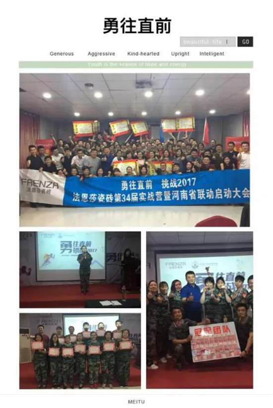 法恩莎瓷磚第三十四屆終端銷售實戰(zhàn)營——河南戰(zhàn)區(qū)開營啦!來自于河南各地的五十余名法恩莎瓷磚終端銷售精英相聚在美麗的鄭州櫻桃園拓展基地,大家斗志昂揚,齊心協(xié)力,開展為期三天三夜的實戰(zhàn)訓練!