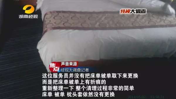 有媒體記者近日在長(zhǎng)沙位于東風(fēng)路、遠(yuǎn)大一路兩家速8酒店展開(kāi)了臥底調(diào)查,首先在遠(yuǎn)大一路店入組酒店,在床單被單枕頭套上做了兩條杠標(biāo)記。次日退房后,另一組記者要了同一間房入住,發(fā)現(xiàn)前一組記者所做的兩條杠標(biāo)記仍然存在,客人睡過(guò)的床單、被單、枕頭套并沒(méi)有換洗。