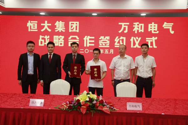 2017年5月22日,恒大集團、萬和電氣戰略合作簽約儀式在廣州恒大中心舉行。恒大集團材料公司總經理蘇鑫與廣東萬和新電氣股份有限公司總裁盧宇聰分別代表恒大、萬和在簽約儀式上簽訂了戰略合作協議。協議約定,未來三年,萬和電氣將向恒大集團供應價值2億元的熱水器及廚房電器產品。此次簽約標志著雙方正式達成戰略合作。