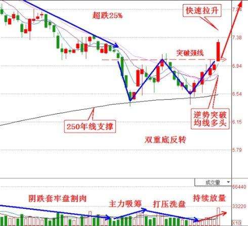股價(jià)從高位超跌25%,在低位形成雙重底反轉(zhuǎn)形態(tài),明顯受到年線支撐。因?yàn)橹髁σ统杀敬罅砍止桑灾篑R上打壓洗盤(pán),清洗獲利盤(pán)和不堅(jiān)定散戶,提高了籌碼穩(wěn)定性。