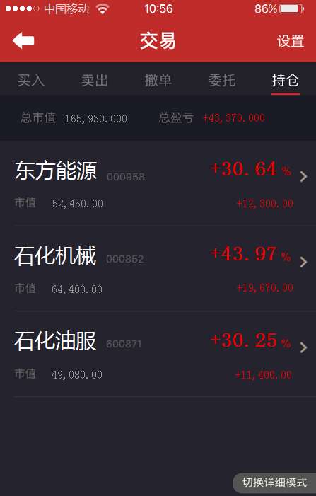 上周另外跟隨主力操作得東方能源、石化油服這里不在多說。東方能源已經(jīng)了結(jié),雖然不是最高但是也有30%得收益到手,石化油服繼續(xù)拿著,晚間看下銀河證券主力得動(dòng)向再說!炒股最重要的是“知進(jìn)退”,而“知行合一”最為困難!