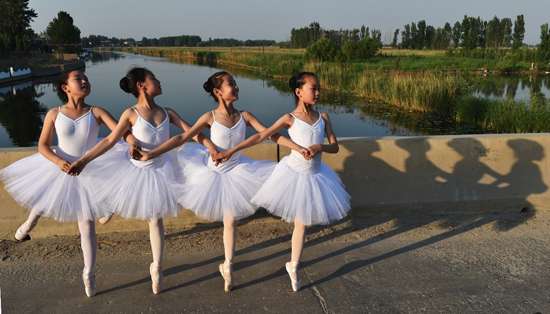11歲的劉奕君(右1)專門從山東老家,來到安新縣學(xué)習(xí)芭蕾。