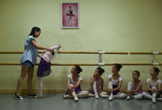來自北京舞蹈家協(xié)會的芭蕾舞老師張萍正在安新縣端村學(xué)校教授孩子們芭蕾舞課程。