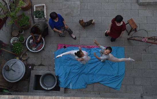 11歲的王家存在家里和同伴劉奕君在院里鋪著的一床被子上練習(xí)芭蕾動作。