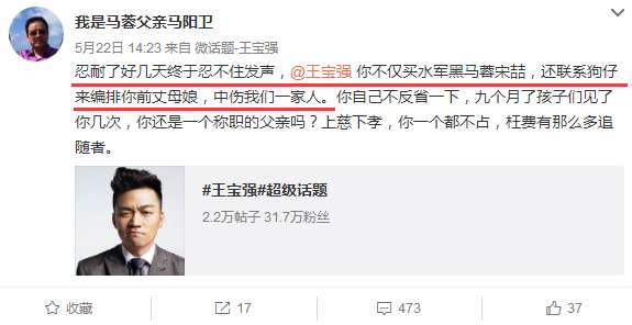 馬蓉父親曾經(jīng)在5月22日下午兩點多公開懟王寶強:忍耐了好幾天終于忍不住發(fā)聲,王寶強你不僅買水軍黑馬蓉宋喆,還聯(lián)系狗仔來編排你前丈母娘,中傷我們一家人。你自己不反省一下,九個月了孩子們見了你幾次,你還是一個稱職的父親嗎?上慈下孝,你一個都不占,枉費有那么多追隨者。