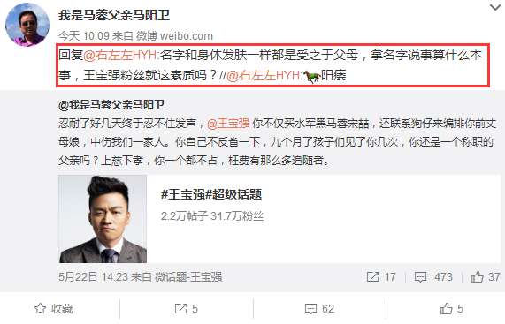 對于馬蓉父親如此惡心行為,有粉絲吐槽說他是陽痿。隨后馬蓉父親轉(zhuǎn)發(fā)該條評論嗆聲說:名字和身體發(fā)膚一樣都是受之于父母,拿名字說事算什么本事,王寶強粉絲就這素質(zhì)嗎?