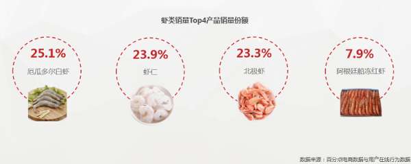 而水產類的采購分布非常廣,由原來的本國采購,到買遍全球。例如生鮮水產中的蝦類最為明顯,電商中最暢銷的4種蝦占蝦類總銷量的80.1%,集中度高、來源廣,這四種蝦中,厄瓜多爾白蝦、北極蝦、阿根廷船凍紅蝦均為進口,消費者更愿意接受進口生鮮產品(見下表);