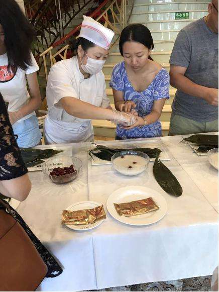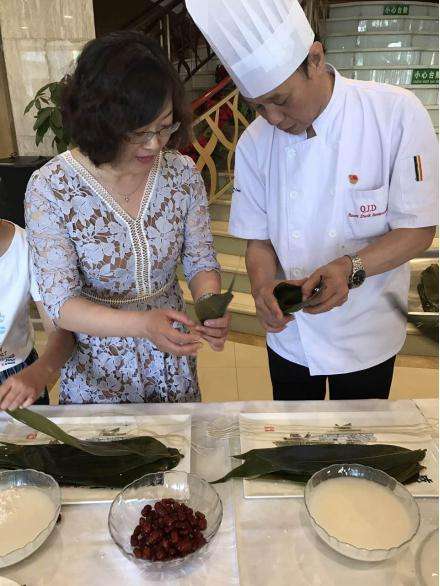 關(guān)廚師長,中國烹飪大師。曾多次授命為多國元首烹制菜肴。近些年又融合通州當(dāng)?shù)靥厣朗常邪l(fā)出多道創(chuàng)新菜品,深受集團(tuán)領(lǐng)導(dǎo)信任、消費(fèi)者好評。關(guān)廚師長廚政經(jīng)驗(yàn)豐富,將中國傳統(tǒng)風(fēng)俗常識講授的細(xì)致生動。大家聽得津津有味,既重溫了傳統(tǒng)習(xí)俗,也深刻了解了全聚德企業(yè)文化,收貨頗多,紛紛舉手想要參與比賽。服務(wù)人員將積極舉手參賽的 5 位顧客,請到臺前,由面點(diǎn)間廚師張紅艷師傅進(jìn)行包粽子示范、指導(dǎo)。展示桌上,擺放了清洗干凈的粽葉、粽繩、糯米、小棗等原材料和器具。將粽葉疊成中心為圓錐形的斗,放入泡好的糯米,放上小棗三四個(gè),再放糯米,將斗口包嚴(yán),用粽繩捆緊。