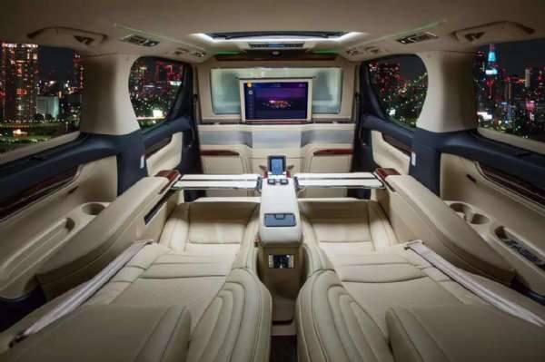 內(nèi)飾方面:皇家貴賓艙商務車配置表電子影音設備一鍵式超靜音24寸高清液晶升降電視車載觸控屏中控系統(tǒng)(人機交換系統(tǒng))智能隱藏儲物柜。