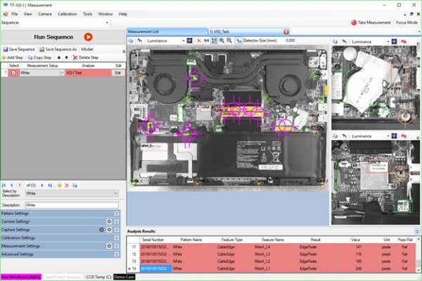VIS-I系統軟件基于Radiant經過現場廣泛驗證的TrueTest軟件,擁有全面的檢測工具庫,可執行各種基本的機器視覺功能,來對機電組件進行驗證和測量。這些工具可確保設備及其部件的制造精度(工具包括定位、測量、存在/缺失、邊線檢測、測量等)。通過充分利用高分辨率、高動態范圍以及基于亮度計評估最小可覺差(JND)功能,VIS-I還能夠執行表面檢測,識別刮痕、壓痕、點和異物等異常缺陷。VIS-I利用基于亮度計的梯度和對比度評估,來定位和識別整個圖像中的對比度異常性,從而能夠檢測到傳統機器視覺系統可能會忽視的細微缺陷,避免所裝配的設備出廠后由此引起潛在故障。
