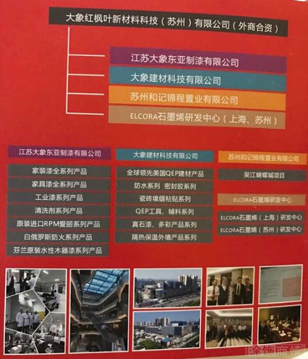 在宣傳資料中,大象紅楓葉卻被描述為“中加合資”(“加”指加拿大)。其表示,2017年,“公司將組建全新的架構,新成立中加合資的大象紅楓葉新材料科技(蘇州)有限公司為母公司,大象制漆(江蘇大象東亞制漆有限公司)、大象建材(大象建材科技有限公司)、大象房產(chǎn)(蘇州和記錦程置業(yè)有限公司)三大子公司。”