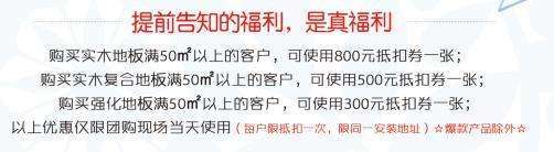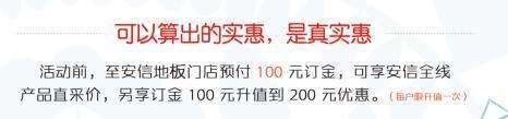 據了解,此次直采日活動中,不僅二翅豆等爆款產品開啟促銷活動的序幕,還有三重優(yōu)惠好禮感恩回饋,一重好禮:在活動前,至安信地板門店預付100元定金,在購買產品時,立享定金100元升值200元優(yōu)惠并享受安信全線產品直采價。二重好禮:在購買實木地板,實木復合地板和強化地板時滿50m2 以上的用戶,可使用300-500元不等金額抵扣券一張;三重好禮:在活動現場中,在購買地板的同時選購安信木門的用戶,可享木門訂單9.5折優(yōu)惠,并配送五金等配件和安裝等服務。