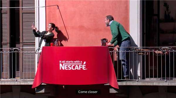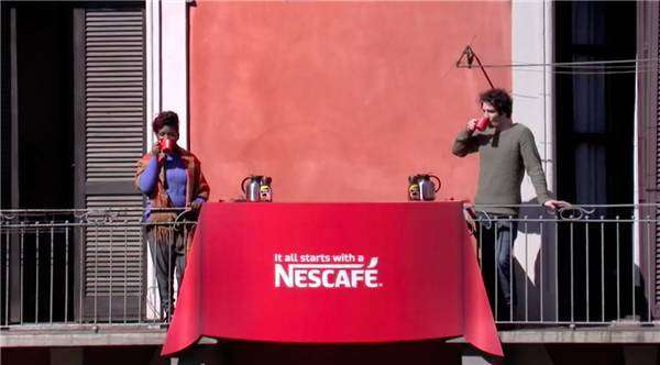 在一個夜深人靜的晚上,雀巢悄悄地在一棟公寓樓每兩個相鄰的陽臺前,架起了一個個雀巢咖啡桌。每個桌子的兩端都放置了雀巢咖啡。當他們早上走到陽臺,可以端起咖啡,與鄰居一起分享這令人驚喜的清晨。
