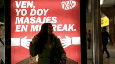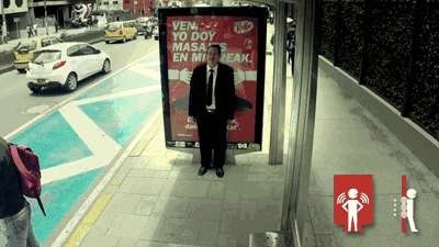 KitKat,可以給人按摩的廣告牌。內(nèi)有傳感驅(qū)動裝置,人一靠近就會運轉(zhuǎn),等公交無聊了,哪里酸痛蹭哪里~
