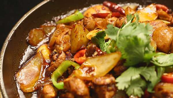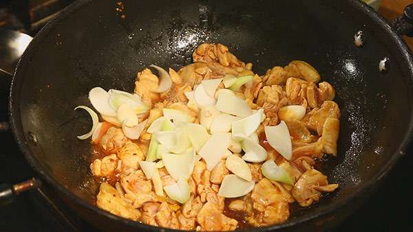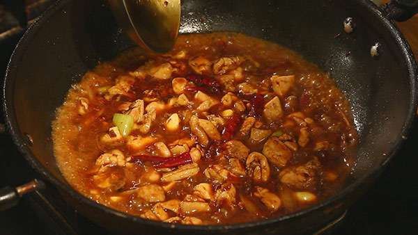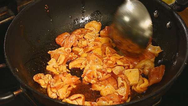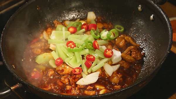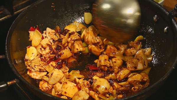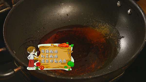 4.辣椒油混合花椒油炒制雞肉。