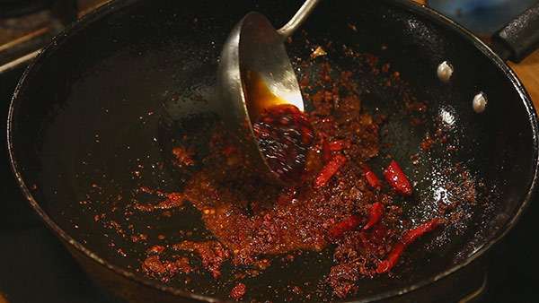 3.放入郫縣豆瓣醬、辣椒面、干辣椒、花椒、豆豉炒香后,取出。