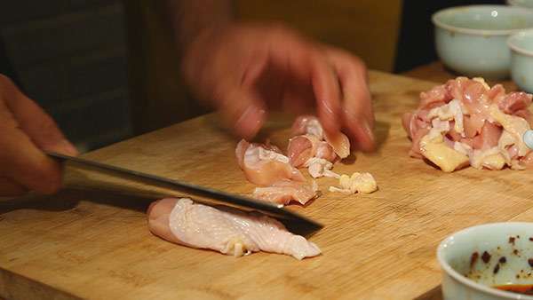 1.將雞腿肉切成栗子大小的塊。