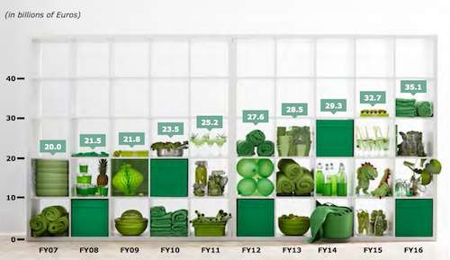 宜家2007財年到2016財年,總收入增長變化(單位:十億歐元)