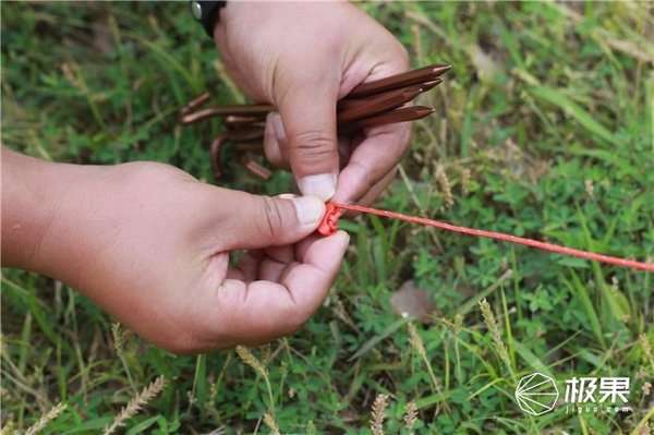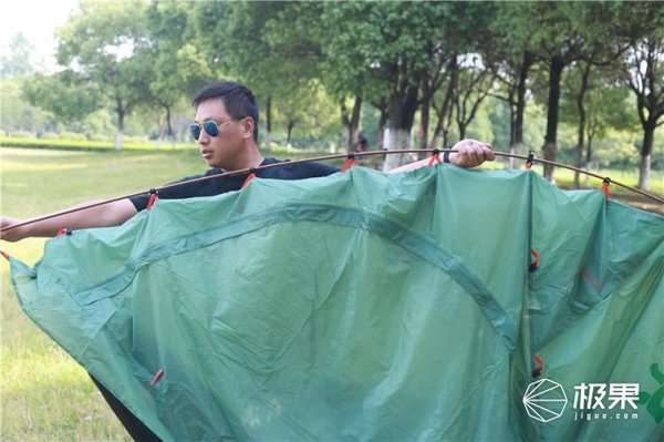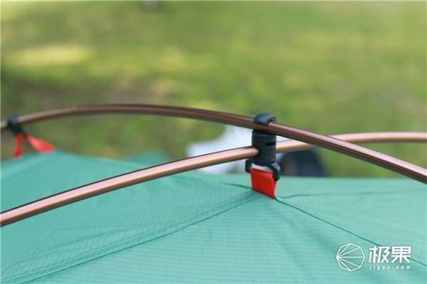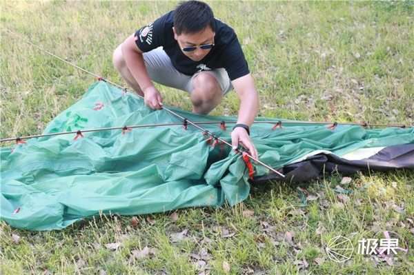 支架桿連接好之后,穿過(guò)帳篷上對(duì)應(yīng)的孔。