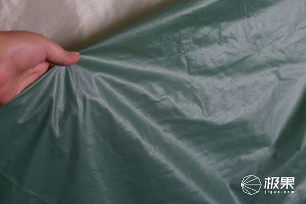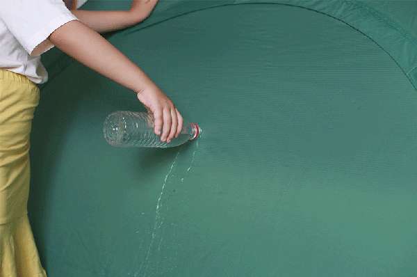 住帳篷面料上潑上水,水很順順著面料下滑,表面上只有少許水珠。翻開(kāi)面料另一面,完全沒(méi)有水滲透現(xiàn)象。