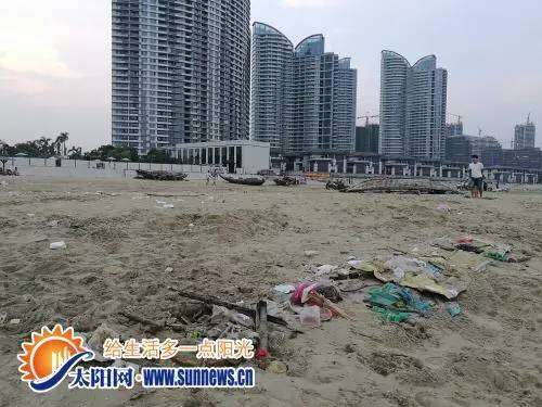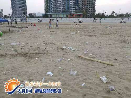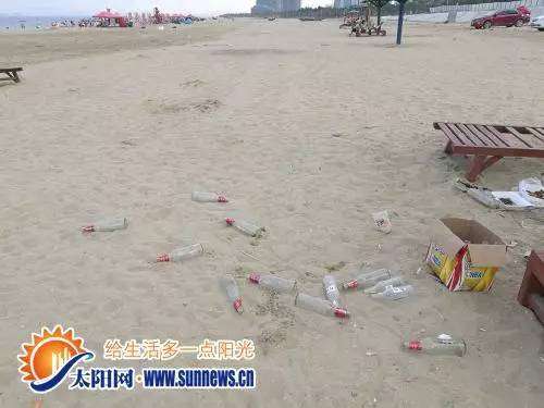 這片沙灘上有不少隨意丟棄的燒烤串簽、啤酒瓶、塑料袋等