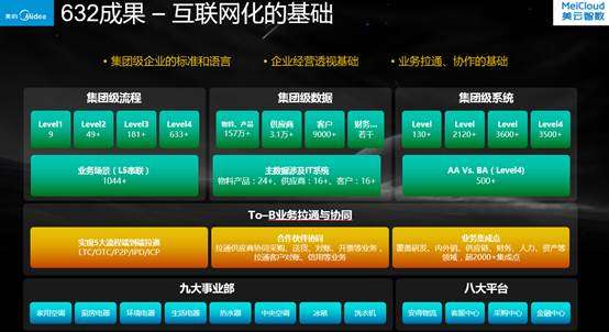 如今,美的集團“632”戰略已經取得明顯進展,實現了家用空調、廚房電器等九大事業部以及安德物流、客服中心等八大平臺的To B業務拉通與協同,建立了集團級企業標準和語言。