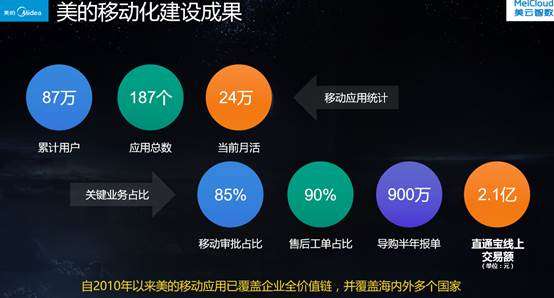 在移動化方面,美的構建了TO C、TO B、TO E的移動化建設布局,通過App+微信,提供面向消費者的一站式服務,并打通企業全流程價值鏈,實現信息共享,提升協同效率。自2010年以來,美的移動應用已覆蓋企業全價值鏈,并覆蓋海內外多個國家。