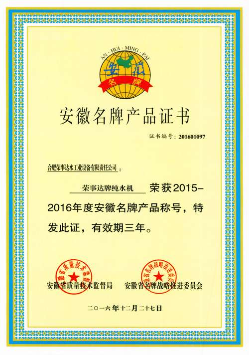 \u00A0\u00A0\u00A0\u00A0日前,安徽省質(zhì)量技術(shù)監(jiān)督局、安徽省名牌戰(zhàn)略推進(jìn)委員會(huì)正式公示2015-2016年度安徽名牌產(chǎn)品榜單,合肥榮事達(dá)水工業(yè)設(shè)備有限責(zé)任公司申報(bào)的“榮事達(dá)牌純水機(jī)”產(chǎn)品榮列榜中,成為安徽凈水行業(yè)首家榮獲“省級(jí)名牌產(chǎn)品”稱號(hào)的企業(yè),榮事達(dá)水工業(yè)公司強(qiáng)勁實(shí)力再次獲得政府和社會(huì)的充分肯定。