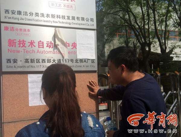 在西安康潔公司的大門口,工商高新分局投訴舉報(bào)中心張貼了一份“關(guān)于對(duì)康潔公司自行停業(yè)處理情況的通知”。通知中稱,該公司及其洗衣店因自行停業(yè)導(dǎo)致無法為其會(huì)員和顧客提供服務(wù),此事已引起政府和相關(guān)主管部門的重視。消費(fèi)者可按屬地管轄原則,攜帶相關(guān)資料到轄區(qū)工商部門投訴維權(quán)。 華商記者 張成龍 攝影 強(qiáng)軍