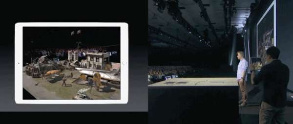 ARKit 包含尺度估算、運動跟蹤、環境光評估等功能,并能支持 Unity,Unreal,SceneKit 等虛擬環境開發工具。為了展示 ARKit 功能的強大,蘋果播放了一段簡短的 Pokémon Go的展示視頻,并在該視頻后邀請 Wingnut AR的開發者通過 iPad 現場展示了該工作室的 AR 游戲。