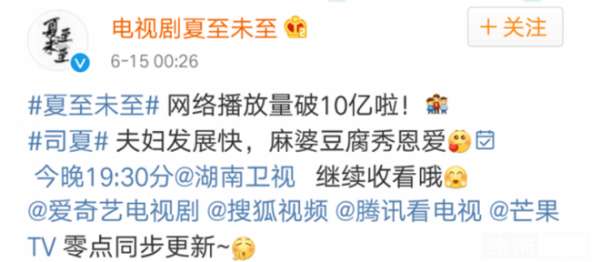《夏至未至》這部劇主打青春校園,因此它的受眾群體比較單一,除了一些書粉以外,基本上是95后、00后的年輕人。但受眾單一不代表數(shù)量小,相反其粉絲群體非常龐大。據(jù)數(shù)據(jù)統(tǒng)計,從開播后,收視率和網(wǎng)絡(luò)播放量一路攀升,在6月13日收視率破1,達到1.59%,其后穩(wěn)居全國同時段電視劇收視率第一;而截至6月15日,該劇的網(wǎng)絡(luò)播放量突破十億,按照此時已播放10集的長度換算,也就是每一集都有差不多1億人在點擊觀看。
