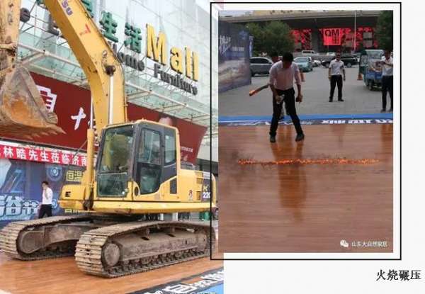 店內(nèi)簽售如火如荼,店外的廣場(chǎng)上也沒(méi)閑著。汽油潑在了地板上,火燒地板的大戲正在上演,這也吸引了不少吃瓜群眾的圍觀(guān)。現(xiàn)場(chǎng)見(jiàn)證了大自然地板的火燒碾壓實(shí)驗(yàn),20噸挖掘機(jī)地板碾壓,地板毫發(fā)無(wú)損的過(guò)硬質(zhì)量引起消費(fèi)者陣陣驚呼。工作人說(shuō):“這種品質(zhì)的檢測(cè)試驗(yàn)在建材市場(chǎng)非常少見(jiàn),但可以最震撼最直觀(guān)的讓消費(fèi)者感受到產(chǎn)品質(zhì)量。”