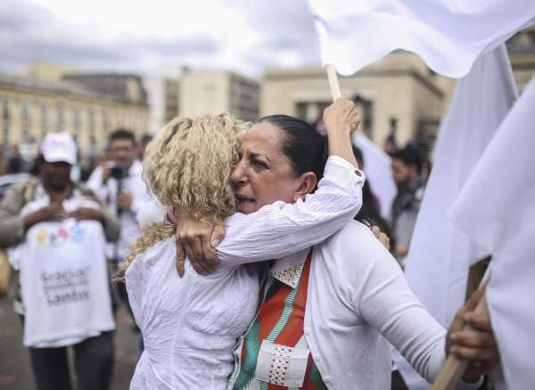 2016年11月24日,在哥倫比亞波哥大,兩名支持簽署和平協(xié)議的女子相互擁抱。(新華社/美聯(lián))