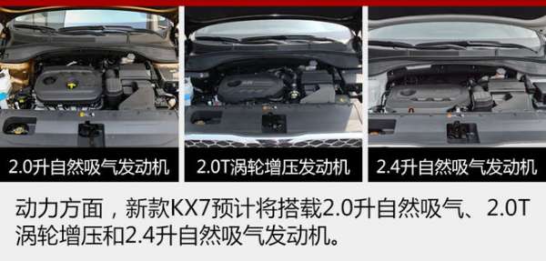 動力方面,新款KX7預(yù)計將延續(xù)現(xiàn)款車型動力配置,搭載2.0升自然吸氣、2.0T渦輪增壓和2.4升自然吸氣發(fā)動機。其中,2.0升發(fā)動機最大功率120千瓦,峰值扭矩203牛米;2.0T GDI發(fā)動機最大功率177千瓦,峰值扭矩353牛米;2.4升發(fā)動機最大功率138千瓦,峰值扭矩241牛米。傳動方面,三款發(fā)動機均將匹配6速手自一體變速箱。(圖/文 網(wǎng)通社 裴健如)