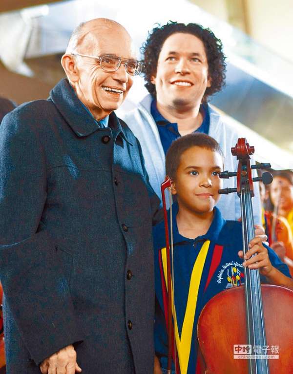 委內(nèi)瑞拉經(jīng)濟學(xué)家兼音樂家艾柏魯(左一)創(chuàng)辦系統(tǒng)教育(El Sistema),透過音樂幫助30多萬邊緣少年走出貧困及罪惡,在全球掀起一股音樂教育社會學(xué)熱潮。左二為受惠於這項教育的青年指揮杜達美。(美聯(lián)社)