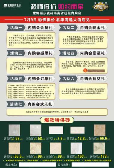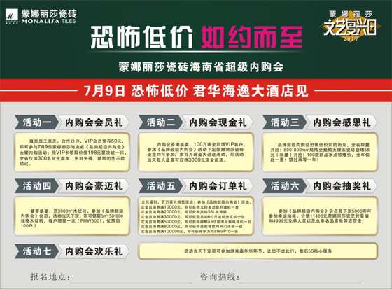 可以想見,7月9日,全省的蒙娜麗莎擁躉們,齊聚一堂,共賀盛事,共同品鑒蒙娜麗莎“大板”的神器出世,并且玩的開心,買的放心,用的順心!蒙娜麗莎瓷磚本次的活動,全程由廠家操盤運作,送的禮品,返的現金,送的家電,抽的獎品,最重要的是給的價格,全部由廠家直接操作,確保海南消費者到了現場就是到了工廠,品牌的承諾和品質的保證,加上這些工廠直接提供的福利,蒙娜麗莎集團股份有限公司7月9日在海口君華海逸二樓宴會廳的這場活動,必將給海南消費者帶來一場難忘的盛宴!
