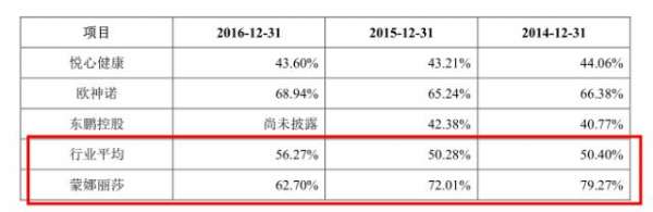 同時,2014年到2016年,蒙娜麗莎集團的資產(chǎn)負債率分別為79.27%、72.01%、62.7%,盡管呈下降趨勢,但這3年負債率平均高出行業(yè)平均水平將近20個百分點。