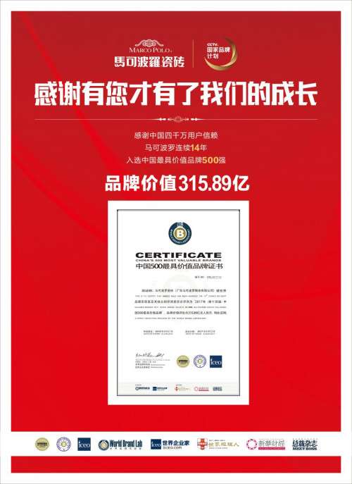 ??會上,世界品牌實驗室發(fā)布了《中國最具價值品牌500強》榜單,馬可波羅瓷磚以315.89億品牌價值,名列榜單第112位,繼續(xù)位列建陶行業(yè)第一!