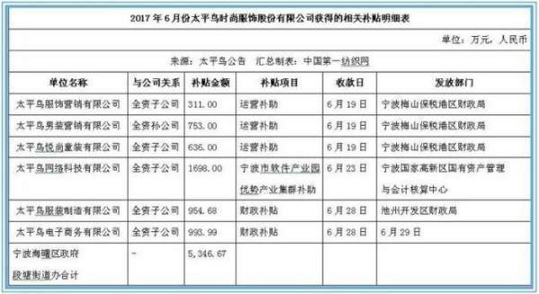 寧波太平鳥時(shí)尚服飾股份有限公司(以下簡(jiǎn)稱“公司”)部分全資子公司、孫公司于2017年6月19日至2017年6月29日期間陸續(xù)收到政府各類大額補(bǔ)貼合計(jì)5346.67萬(wàn)元,相關(guān)補(bǔ)貼明細(xì)如下: