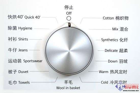 選擇區(qū)域采用了旋鈕式的開關(guān),不同檔位對應(yīng)不同衣物面料,令使用更加方便。同時配合清晰的觸控顯示面板,對溫度、干衣度、定時預(yù)約等等都能一手掌控。