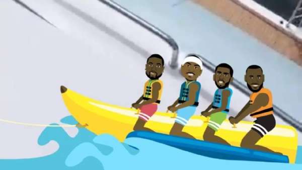 前幾天被拍到在和韋德、詹姆斯一起坐香蕉船游玩的保羅也發(fā)了一根香蕉和船表示要坐香蕉船去找小喬丹…