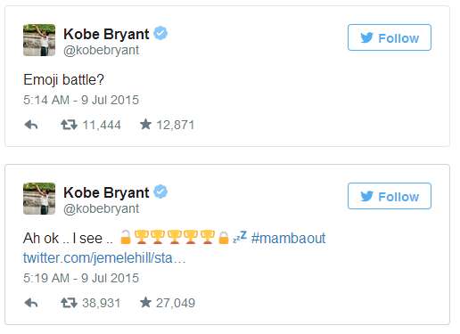 這件事“驚動”了幾乎整個體育圈,包括當時還沒退役的“湖人名宿”科比!他在推特上連發(fā)兩條來湊熱鬧,意思大概是“Emoji大戰(zhàn)?”和“我看看,我有5個總冠軍”。