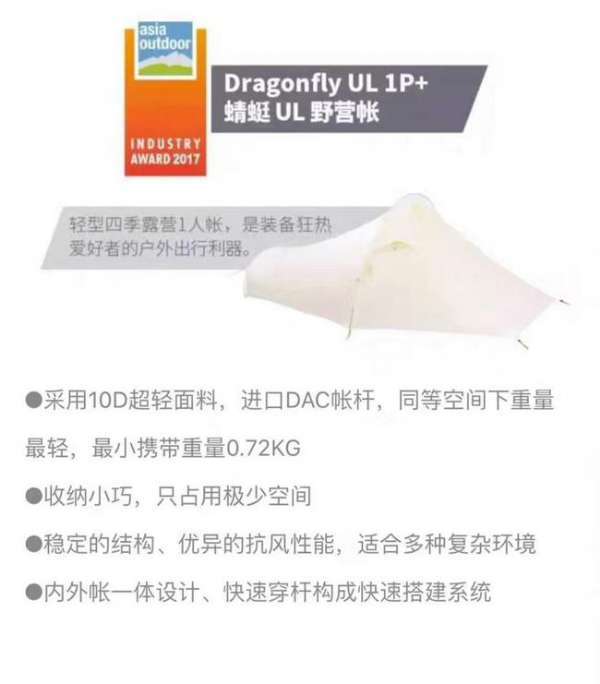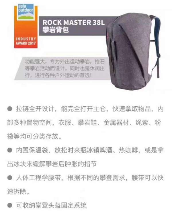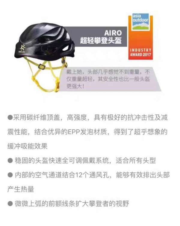 近年來KAILAS凱樂石,以“輕量化革命先鋒”為己任,頻頻在新品研發(fā)上發(fā)力,此次獲獎的三件專業(yè)產(chǎn)品都受到評委會的高度認(rèn)可和評價。KAILAS Dragonfly UL 1P+蜻蜓UL野營帳專為狂熱的戶外愛好者的雙人出行而設(shè)計,采用目前世界上最為輕質(zhì)的10D材料與最為輕量的進(jìn)口DAC羽量級NFL帳桿,構(gòu)成整頂帳篷的主體,其收納體積小巧,只占用極少的空間,整重只有950g,達(dá)到雙人帳中最佳的空間重量比。內(nèi)外帳一體設(shè)計、快速穿桿組成快速搭建系統(tǒng),得益于隧道帳穩(wěn)定的結(jié)構(gòu),優(yōu)異的抗風(fēng)性能,適用于野外各種復(fù)雜環(huán)境。KAILAS Airo超輕攀登頭盔是一款全新一體EPP發(fā)泡材料成型符合亞洲人頭圍需求的超輕量頭盔,碳纖維頂蓋具有極好抗沖擊性和減震性能,滿足攀登者對于安全和重量的極致追求。KAILASRock Master 38L攀巖背包針對攀巖者設(shè)計的功能強(qiáng)大專業(yè)款攀巖背包,亦適用于都市休閑各種運(yùn)動出行,內(nèi)置保溫袋和外置頭盔收納在細(xì)節(jié)處彰顯專業(yè)。