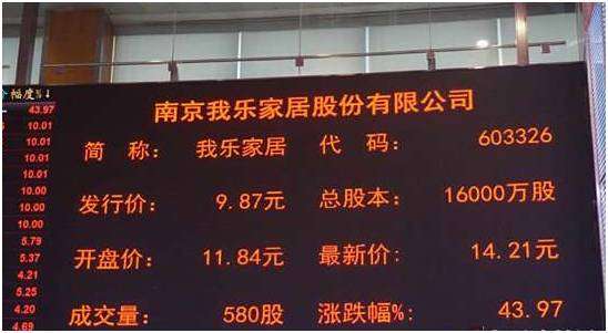 今天,定制家居企業(yè)我樂家居上市,開盤首日,我樂家居大漲43.97%,報收14.21元/股,市值突破22.74億元。